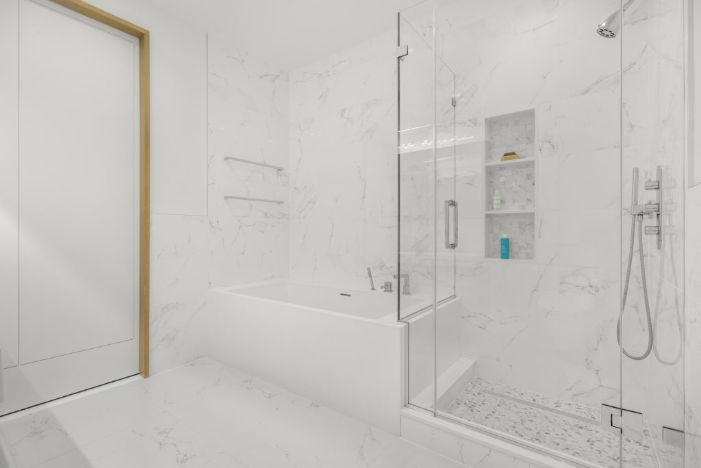 We removed all the water-damaged materials and rebuilt the space from the ground up—new plumbing, waterproofing, and high-end finishes throughout. The transformation includes a sleek floating double vanity, large marble-look porcelain tiles, a custom glass-enclosed shower, and a modern soaking tub.